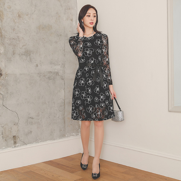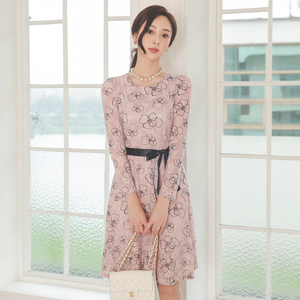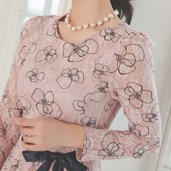 配色 蕾丝 缎子 蝴蝶结 喇叭 连衣裙(长袖)