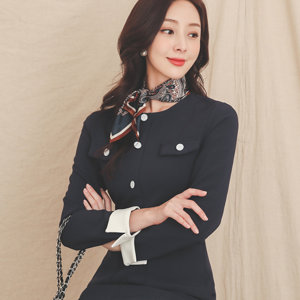 双 翻盖风格 针织 扣子 衣袖配色 连衣裙