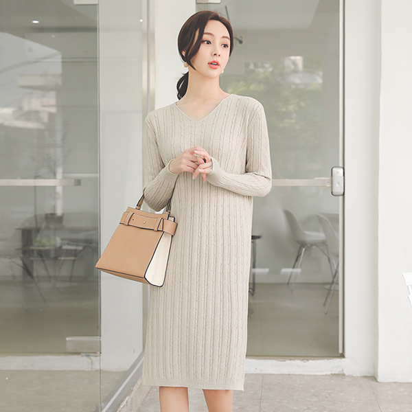 粘胶 修身 麻花 V字领 针织衫 连衣裙
