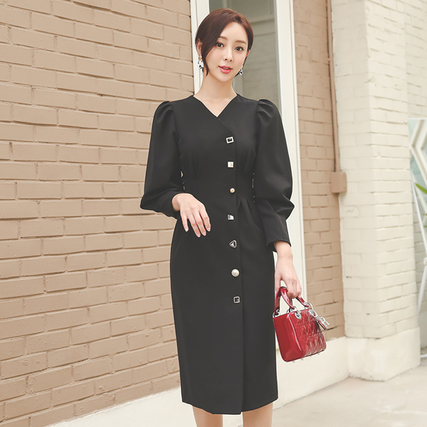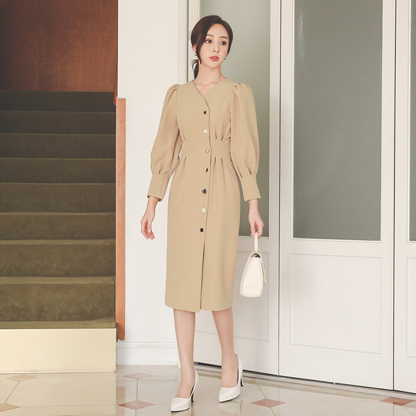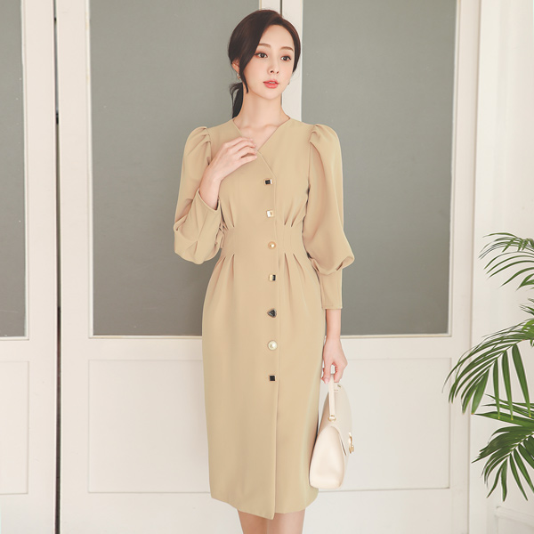淑女 泡泡袖 细褶 扣子 弹力 连衣裙