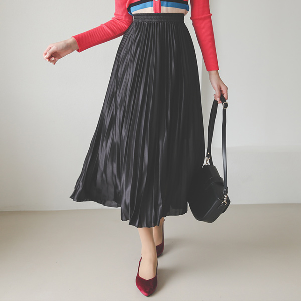 绸缎 松紧带 长款 褶边 裙子