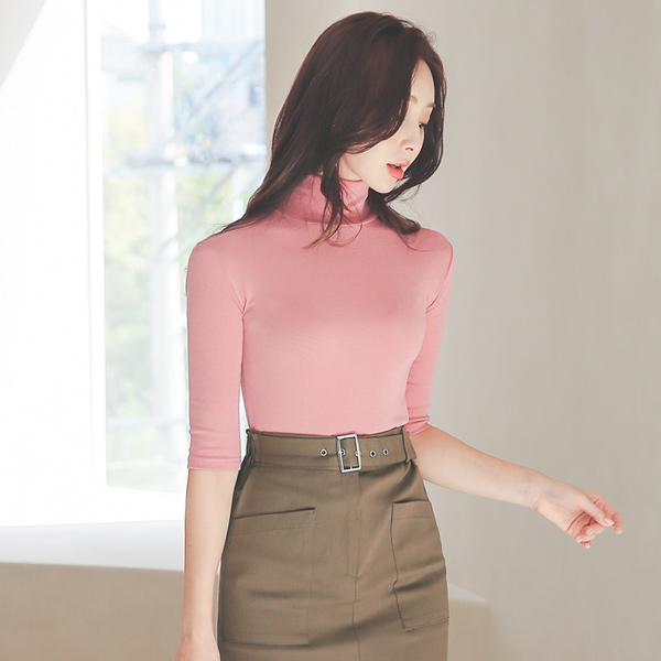 天丝 7分袖 裁剪 高领 T恤衫