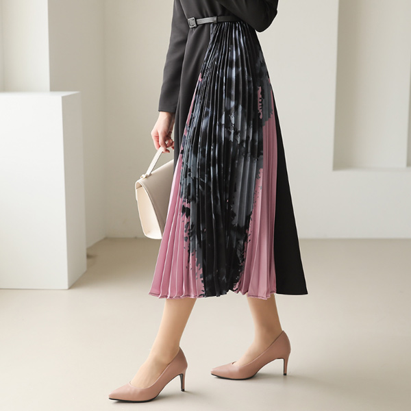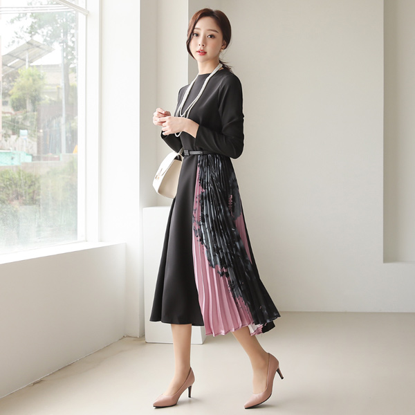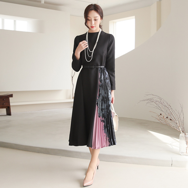 优雅 绸缎 褶边 配色 漏斗领 连衣裙