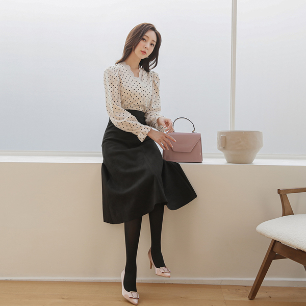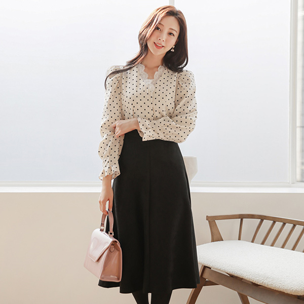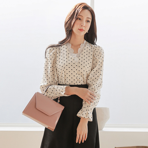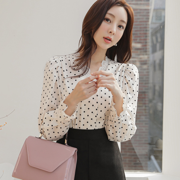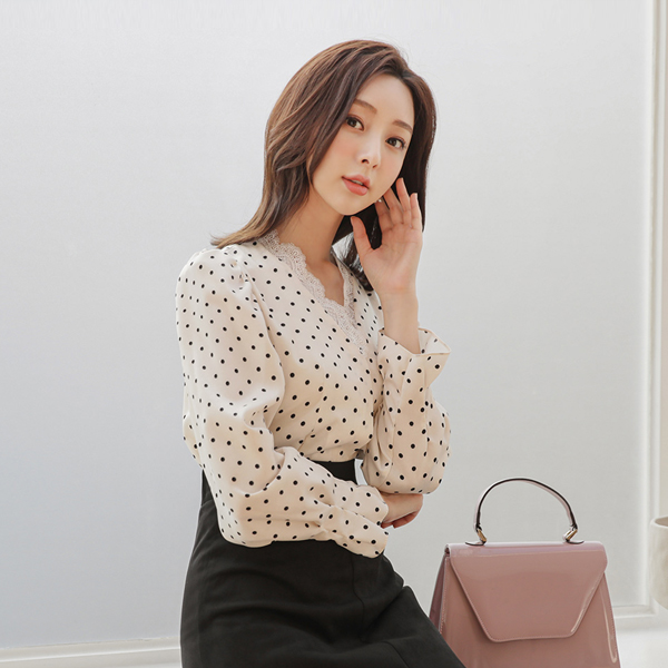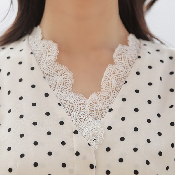 绸缎 圆点 蕾丝 V字领 罩衫