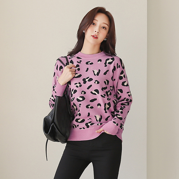 可爱 Leopard 圆领 二重 针织衫