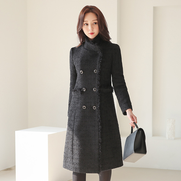 Black 流苏 粗呢 Gold 双排扣 长款大衣
