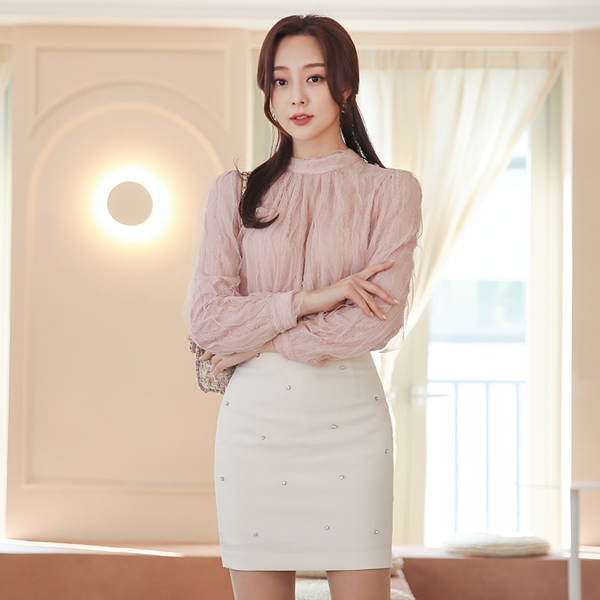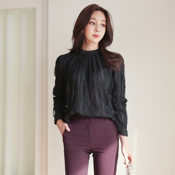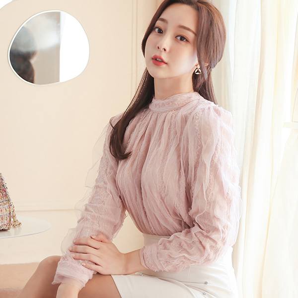 浪漫 蕾丝 波浪卷 半高领 罩衫