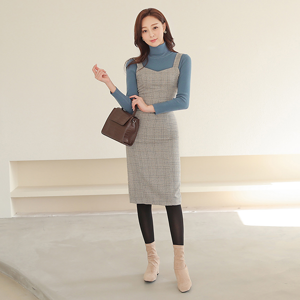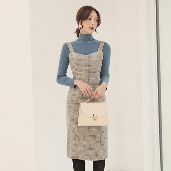 格伦格子呢 修身 H字型 吊带 连衣裙