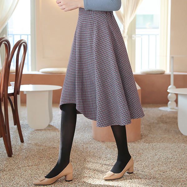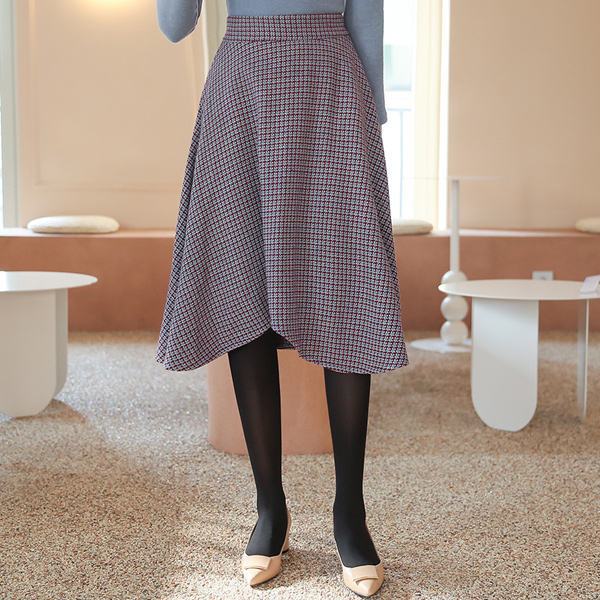 犬牙格子花纹 后侧松紧带 不规则 喇叭 羊毛 裙子