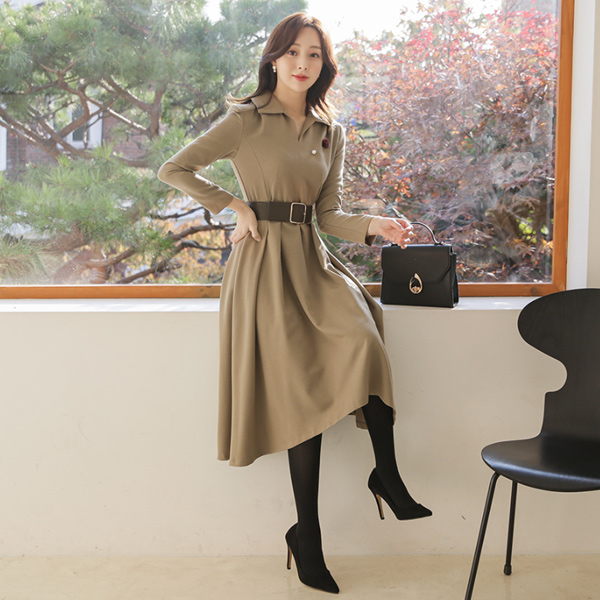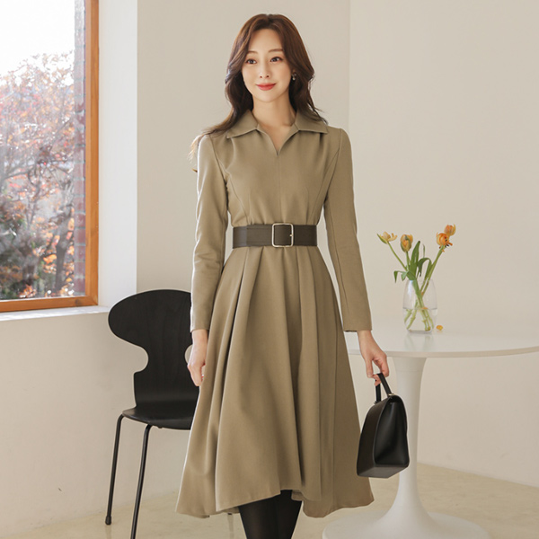 开领 宽腰带 不规则 喇叭 连衣裙