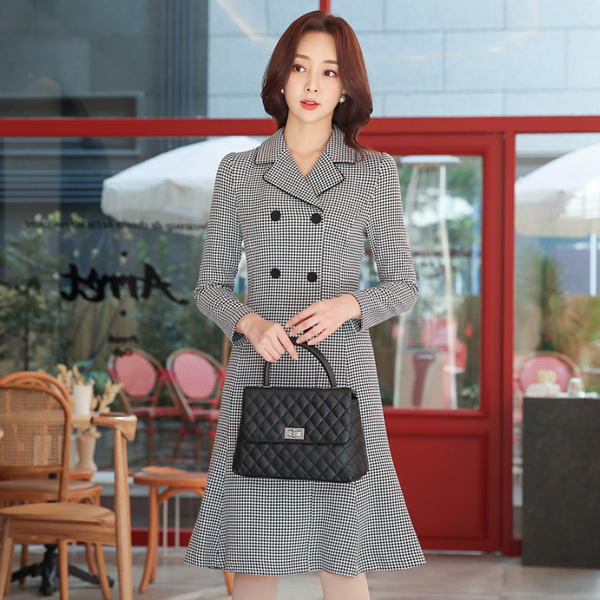 犬牙格子花纹 双排扣 滚边 领子 连衣裙