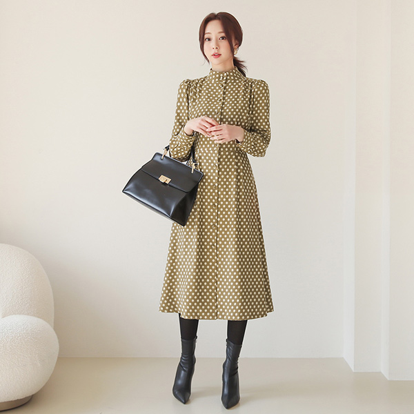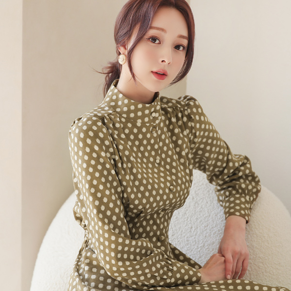 亨利领 圆点 双层细褶 喇叭 连衣裙