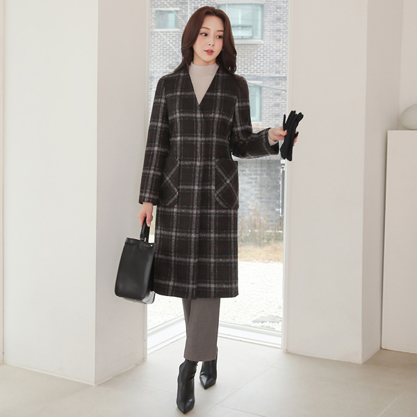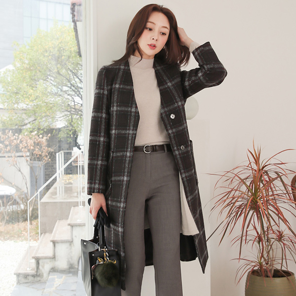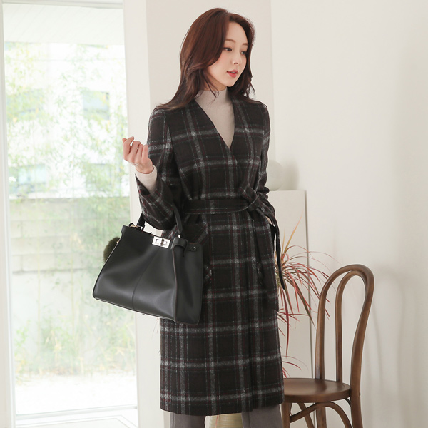 都市 格子 束带 无领 羊毛大衣