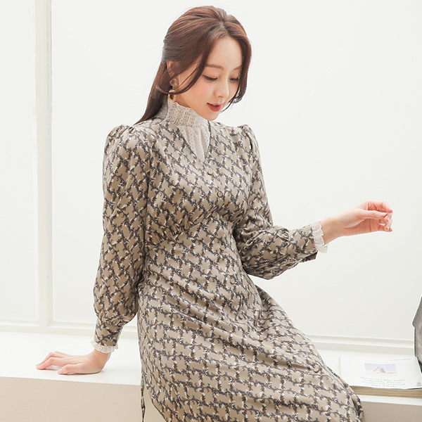 春季 后面蝴蝶结 V字领 拉绒 长款连衣裙