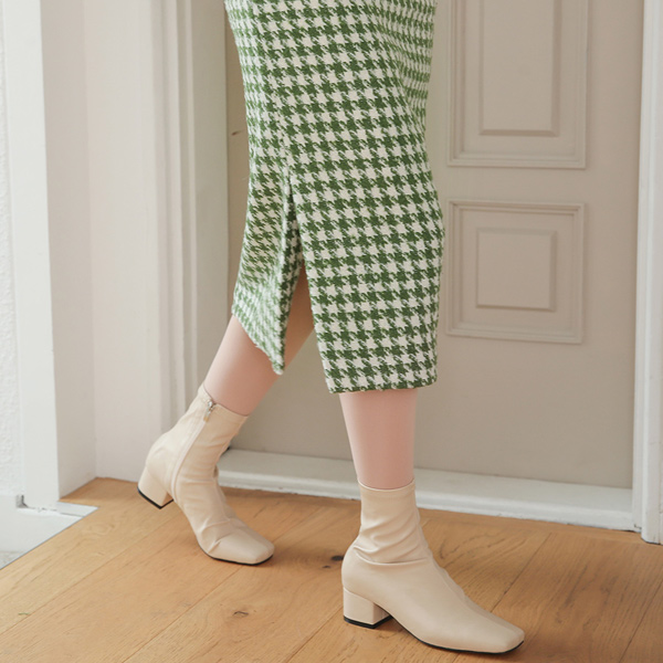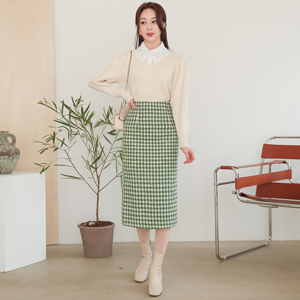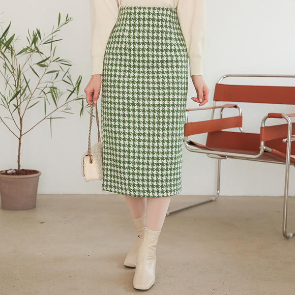金属 犬牙格子花纹 侧纽 开衩 中长款裙