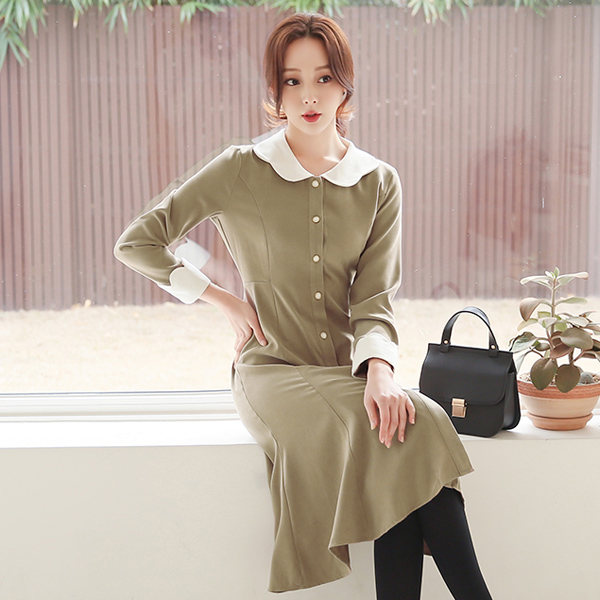 浪漫 波浪卷 领子&袖 配色 连衣裙