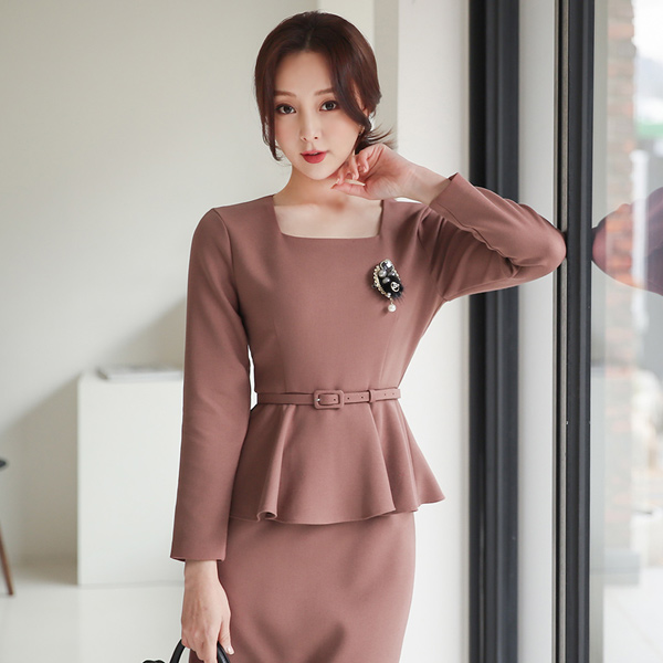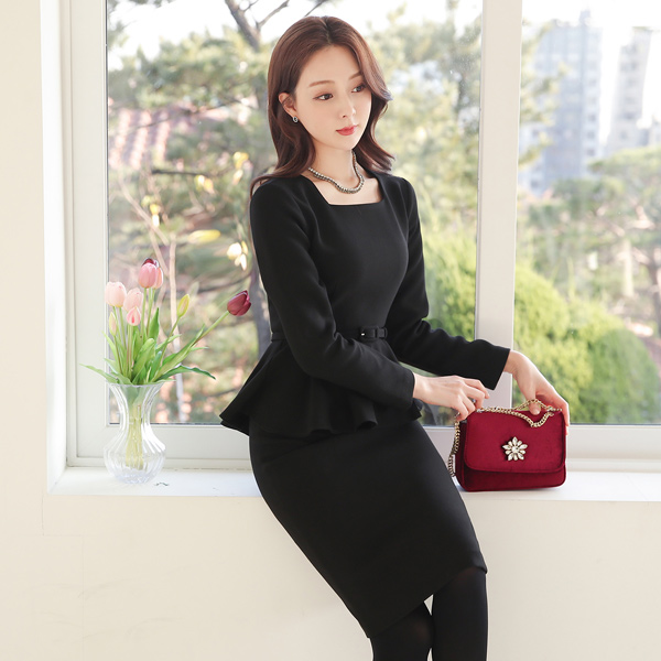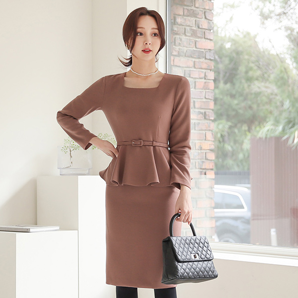 方领 荷叶边 束带 弹力 连衣裙