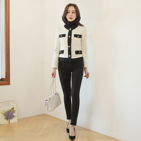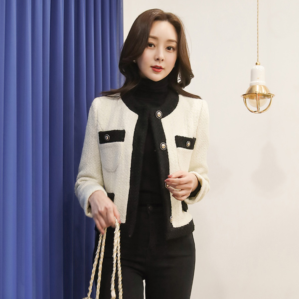 Coco 粗呢 配色 金色纽扣 羊毛 短夹克(绗缝里料)