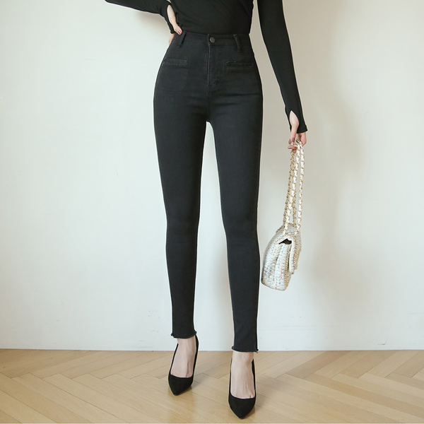 嘴唇口袋 高腰 Black 紧身牛仔裤(衬里加绒)