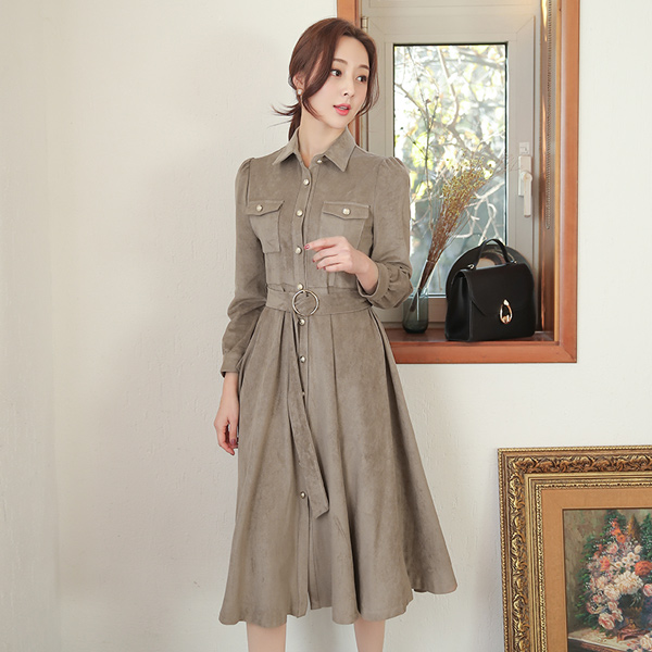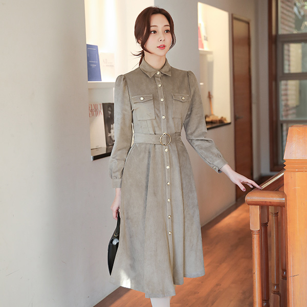 豪华 翻毛皮 Gold 环扣腰带 衬衫 连衣裙