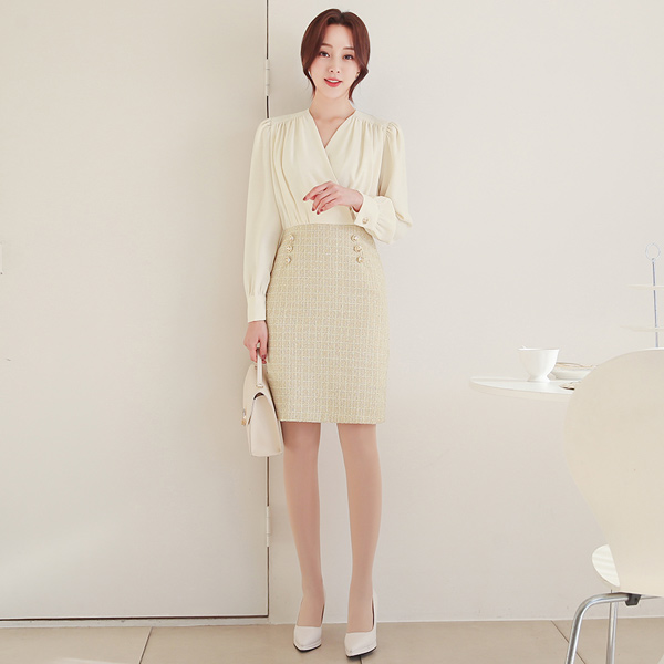 双排扣 粗呢 配色 褶皱 Surplice 连衣裙