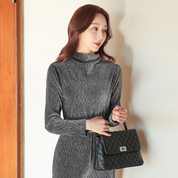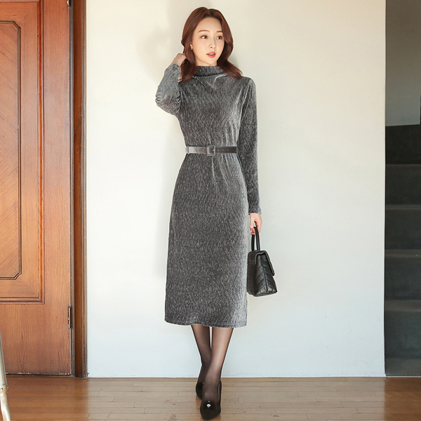 闪亮 去皱纹 丝绒 漏斗领 开衩 长款 连衣裙
