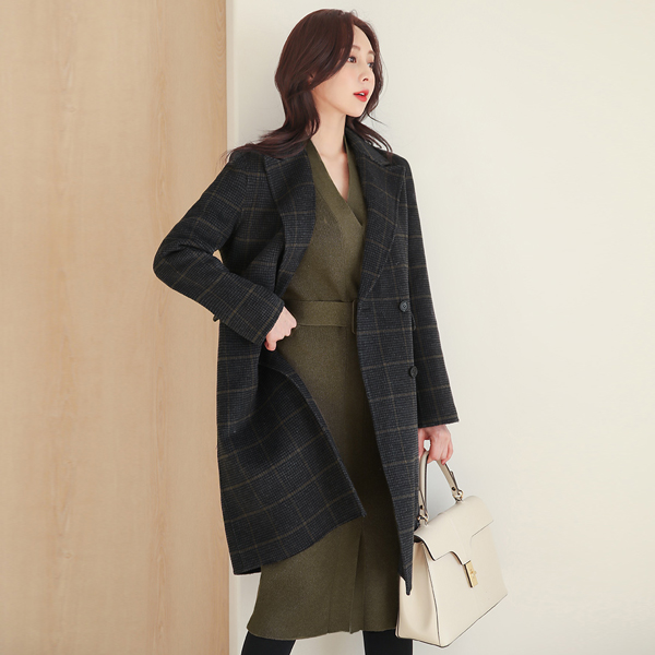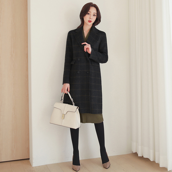 苏格兰格子 手工 双排扣 羊毛大衣(保暖内衬)