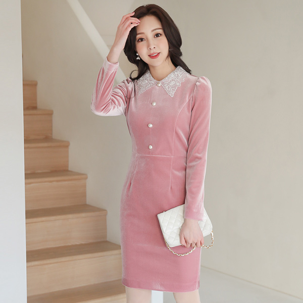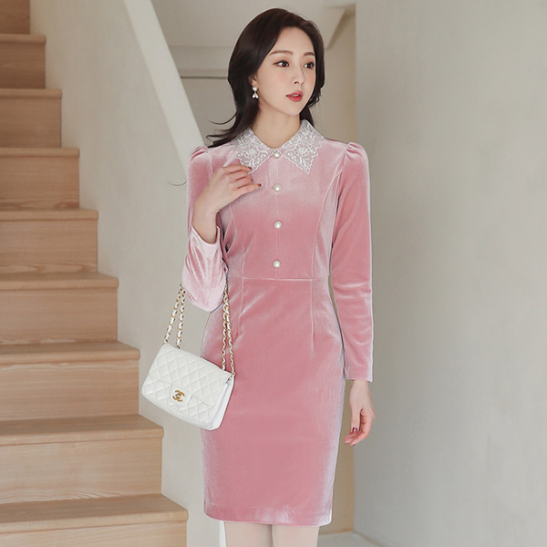 蕾丝领 丝绒 珍珠 连衣裙