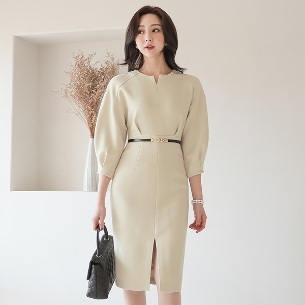 v 开口领子 泡泡袖 开叉 连衣裙