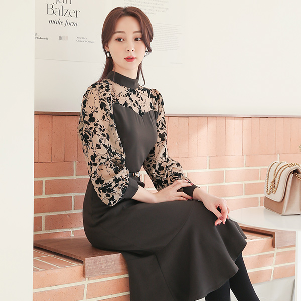 毛织印染 透视 花纹 配色 褶裥 长款连衣裙