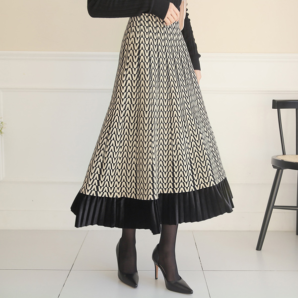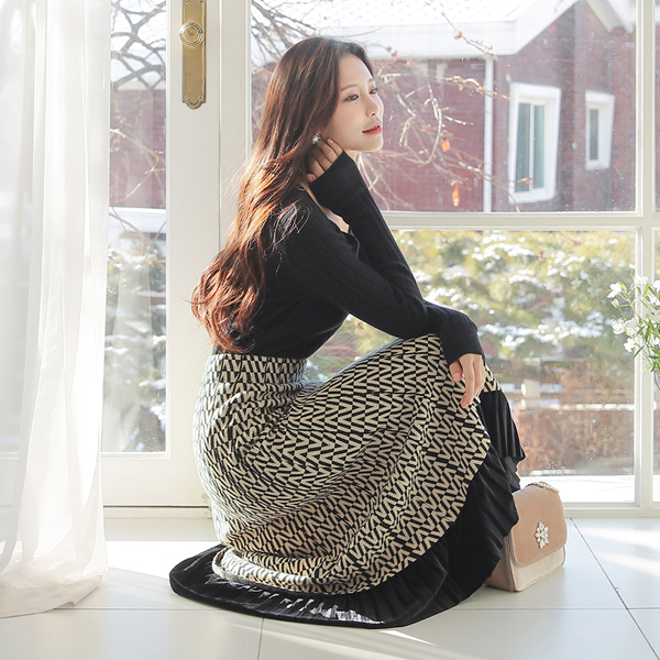 波纹图案 配色 丝绒 褶边 针织半身裙