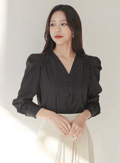 앨리스 圆点 细褶 V字领 泡泡袖 罩衫