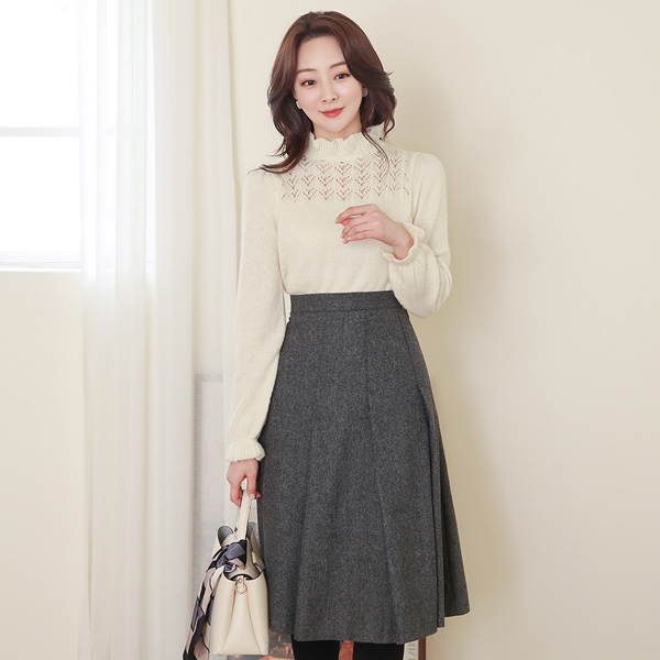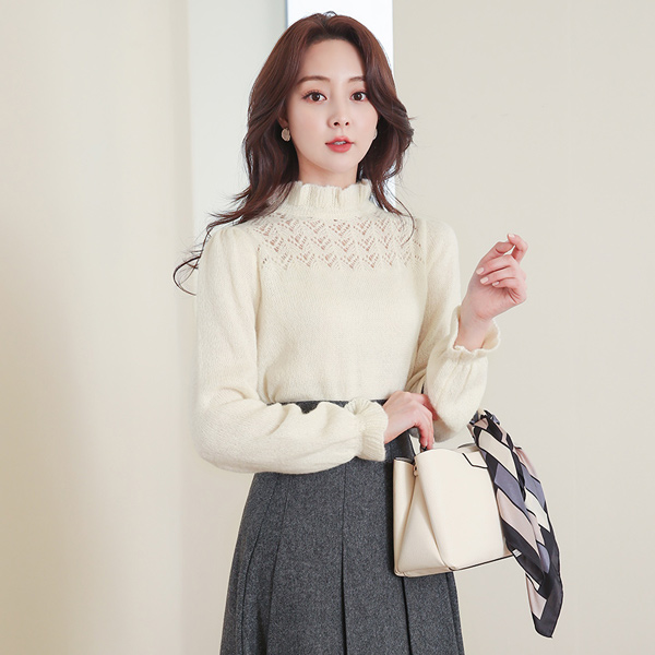钻石纹 印花 荷叶边领 结子花式 羊毛 针织衫