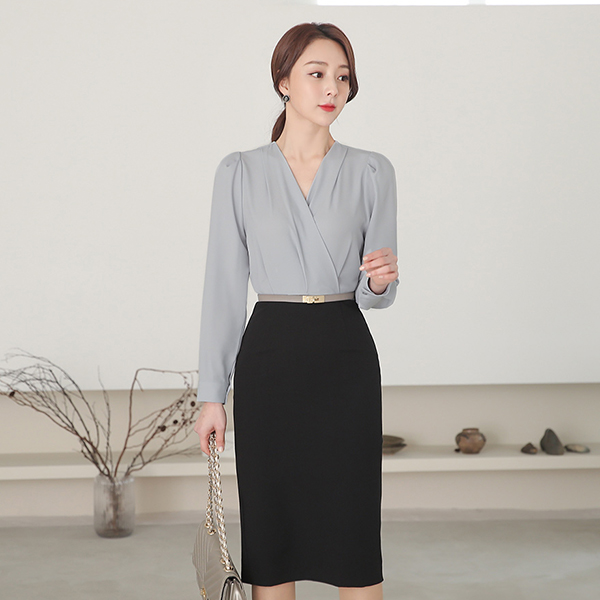 正装 细褶 折叠V领 配色 H字型 连衣裙