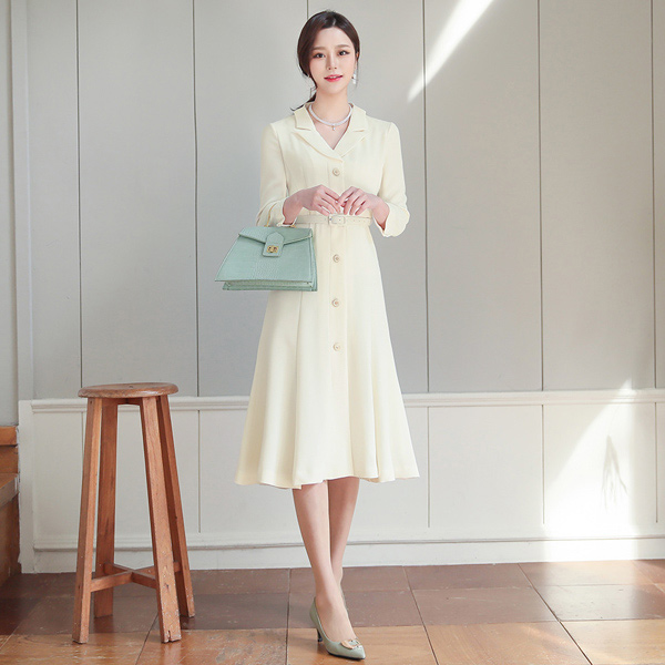 古董 黄金环 扣子 双层领 A字型 连衣裙
