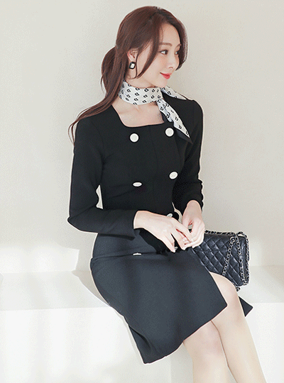 方领 针织 古董 双 扣子 连衣裙