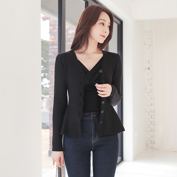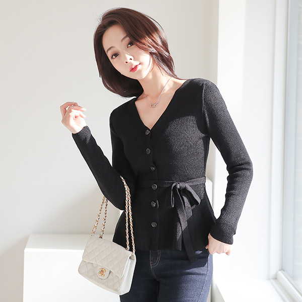 金属 珠光针织 束带 V字领 喇叭 开衫
