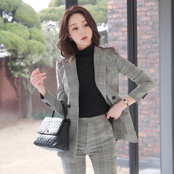 시티 格伦格子呢 双排扣 尖角翻领 夹克