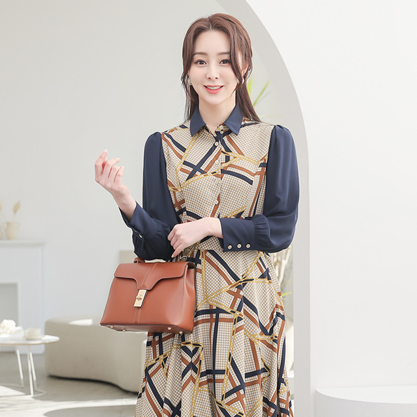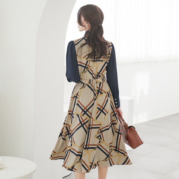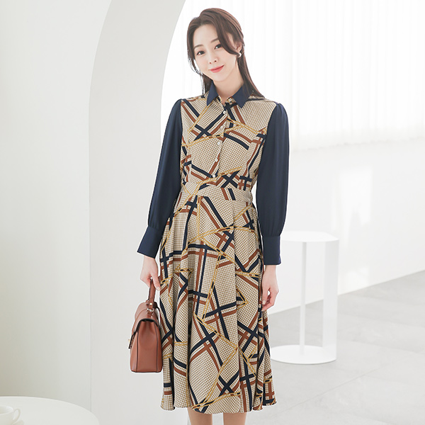 领子衬衫 格子 杖 喇叭 连衣裙