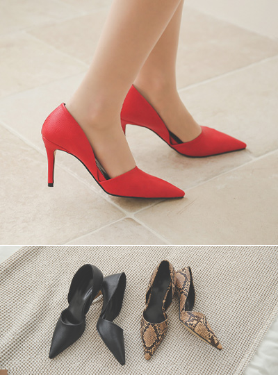 蛇皮纹 侧纽 敞开式 尖头高跟鞋