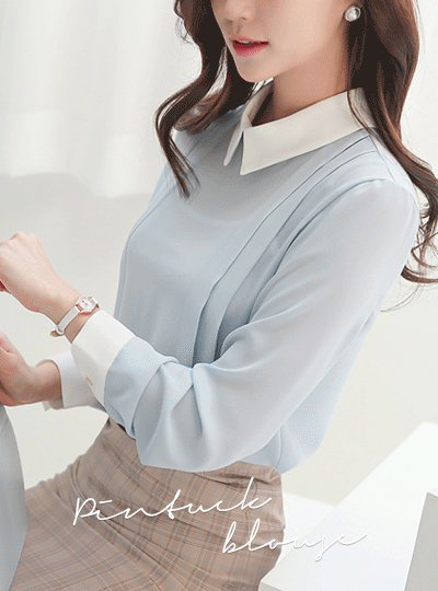 平领 配色 侧纽 细褶 罩衫