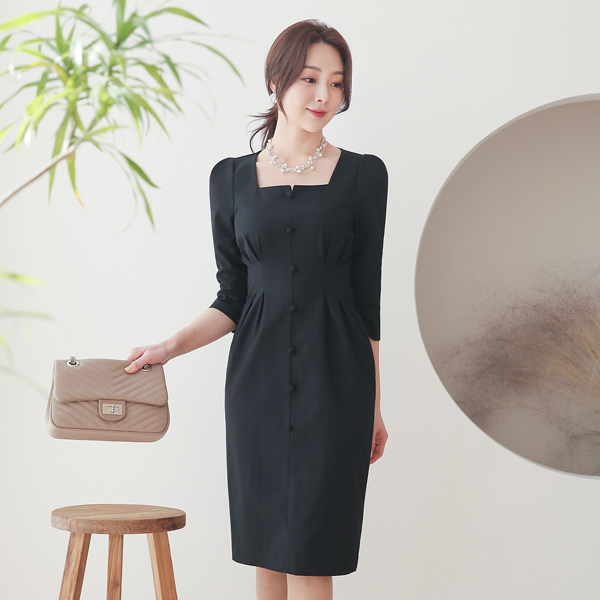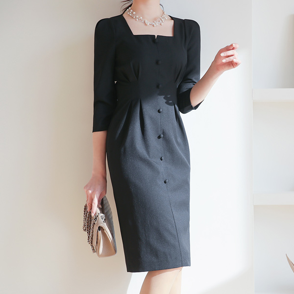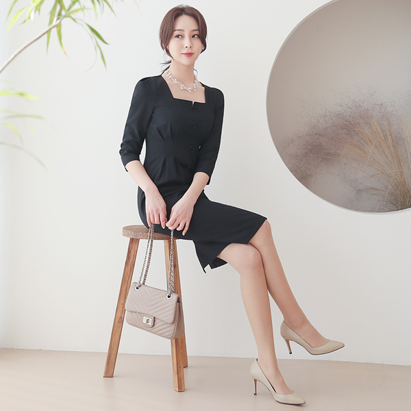 方形 开衩领 豆扣 细褶 连衣裙