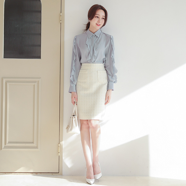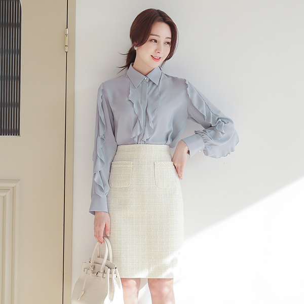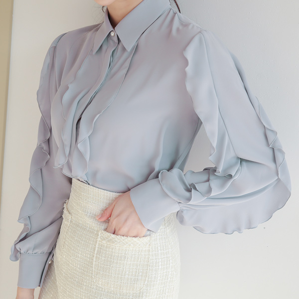 朦胧 荷叶边线条 领子衬衫 罩衫