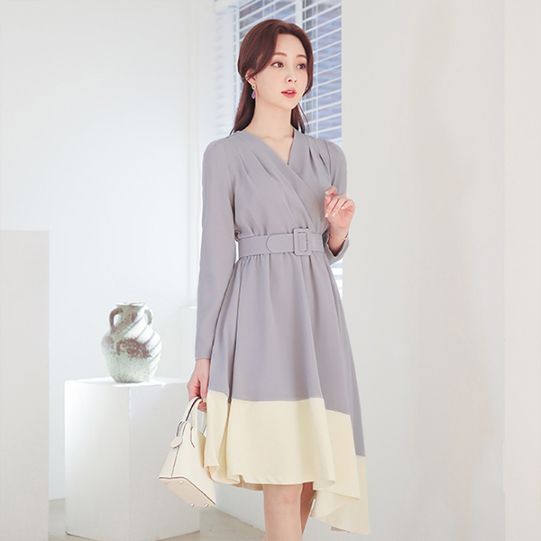 肩膀 细褶 斜线 不规则 配色 喇叭 连衣裙