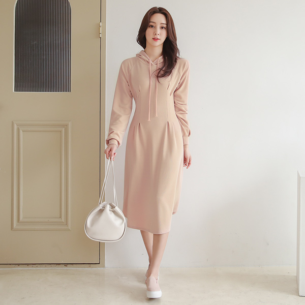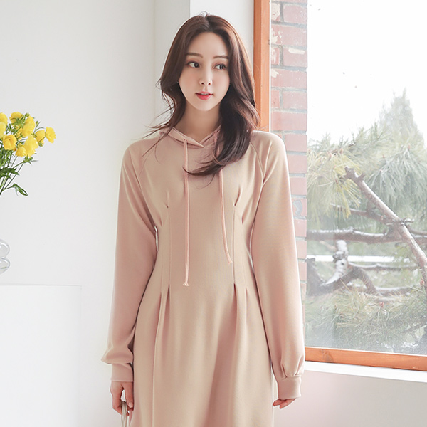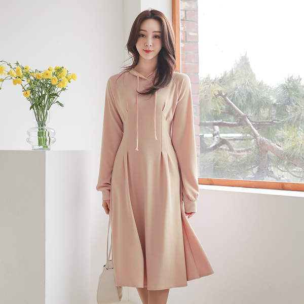 柔色 Dart 细褶 喇叭 带帽 连衣裙
