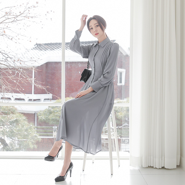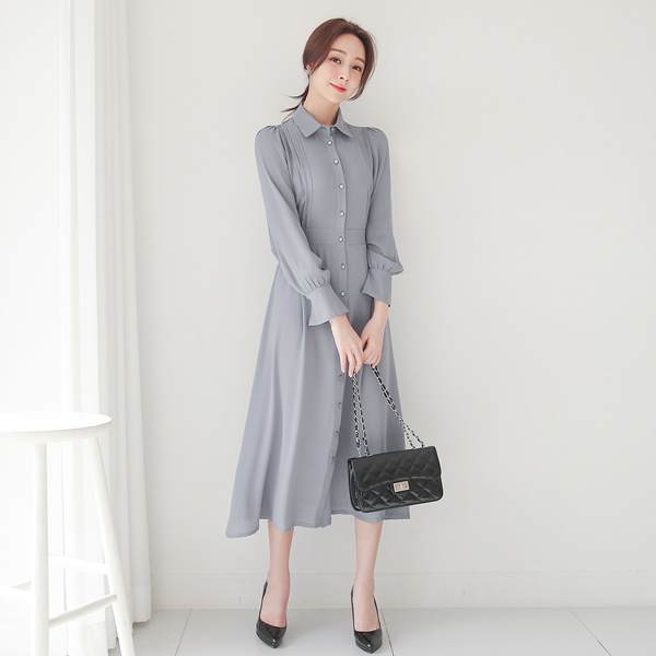 细褶 领子衬衫 喇叭 连衣裙