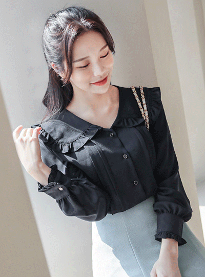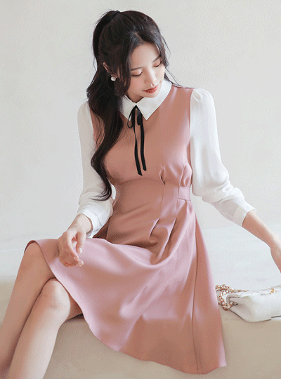 蝴蝶结领结 领子 配色 细褶 喇叭 连衣裙