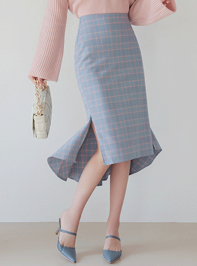 柔色 格子 不规则 开衩 美人鱼 裙子