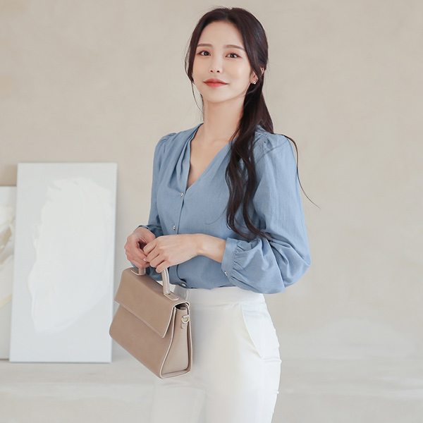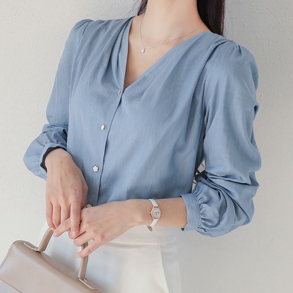 棉 牛仔色 细褶 褶皱 V字领 罩衫