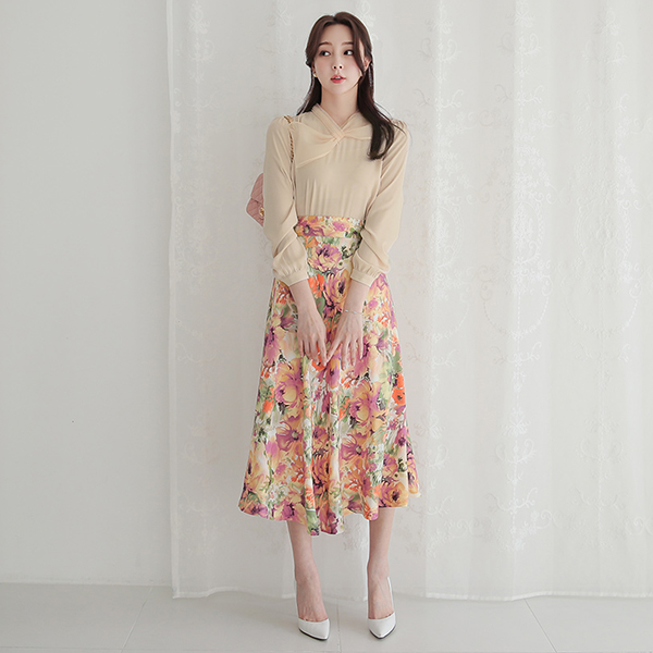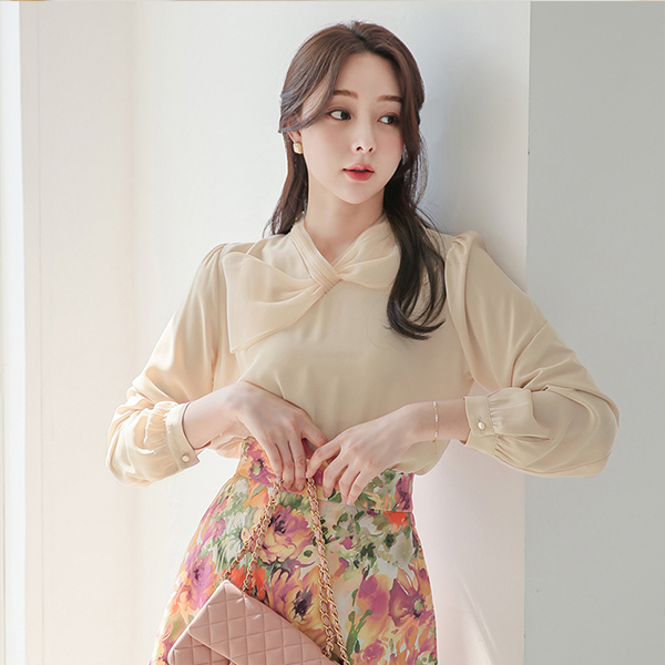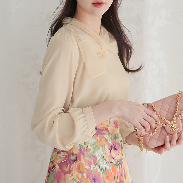 透明硬纱 蝴蝶结 细褶 V领 罩衫